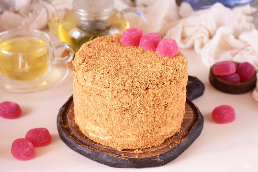 Готовый торт полностью обсыпьте измельченной крошкой — и верх, и бока. Украсьте по желанию, подавайте к столу.