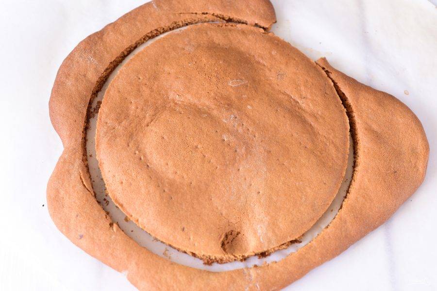 Затем сразу же готовый корж, пока он мягкий, подрежьте ножом в форме круга, у меня круг диаметром 16 см. Обрезки коржа сохраните для обсыпки готового тортика.