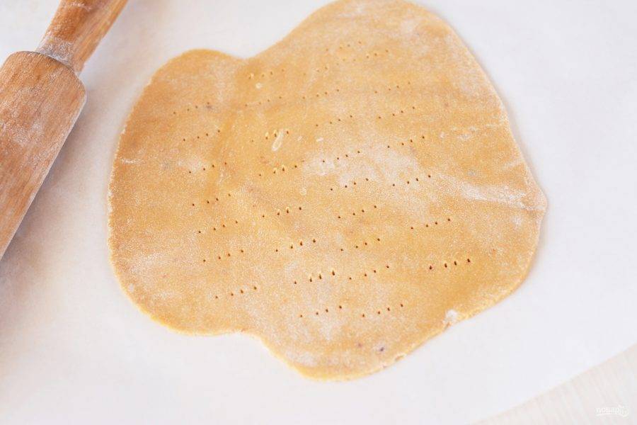 Теперь поделите все тесто на несколько небольших частей. У меня получилось 10 штук. Каждую часть раскатывайте в тонкий пласт и наколите вилкой, я раскатывала на пергаменте для выпекания. Духовка уже должна быть разогрета до 180 градусов. Выпекайте раскатанную часть теста 5-7 минут.
