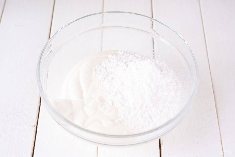 Приготовьте крем: в отдельной миске соедините жирную сметану и сахарную пудру. Чтобы сметана стала еще гуще я отвесила ее марле в течение 4-х часов.