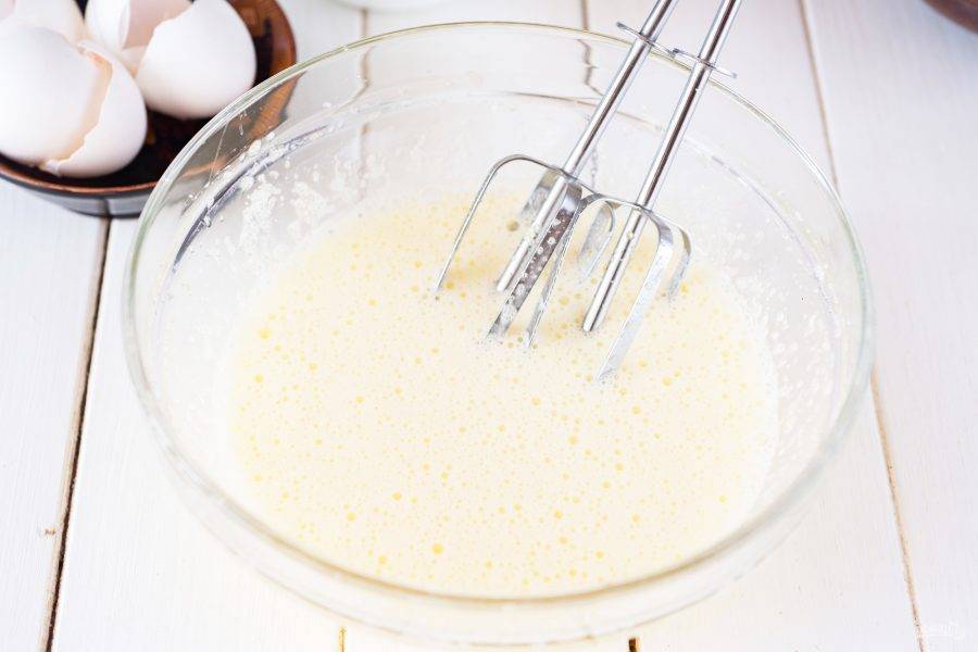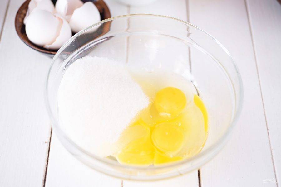 В отдельную миску вбейте яйца и добавьте весь сахар.