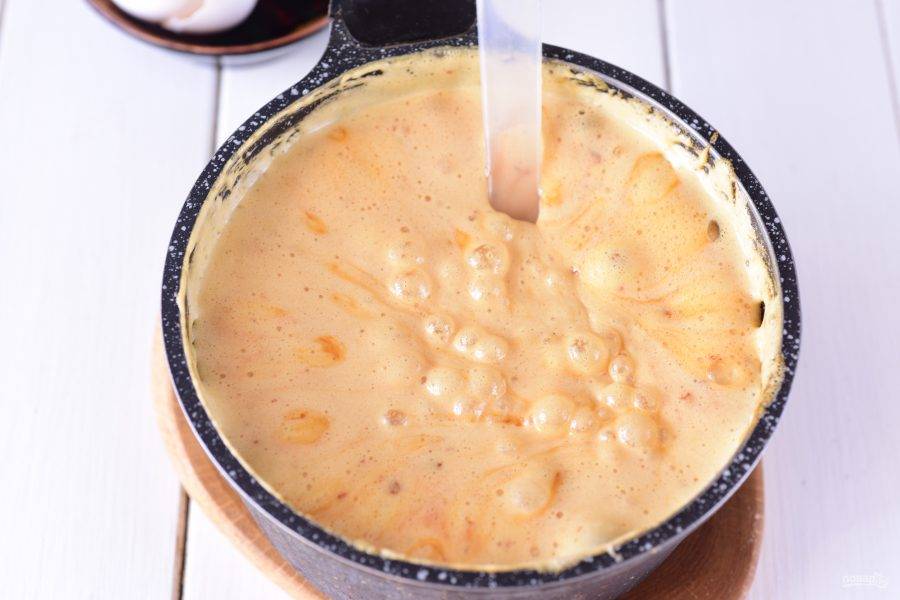 Затем всю эту смесь верните в кастрюльку с толстым дном, добавьте соду, доведите на небольшом огне до кипения. Важно, чтобы ваша кастрюлька имела толстое дно и качественное антипригарное покрытие, иначе смесь подгорит. Под действием нагрева мед войдет в реакцию с содой и смесь начнет бурлить и подниматься, при этом приобретет карамельный оттенок.