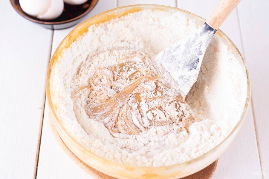 Добавьте в сотейник с карамельной смесью 200 грамм муки и лопаткой вмешайте ее, чтобы мука смогла завариться. После чего снимите сотейник с плиты.