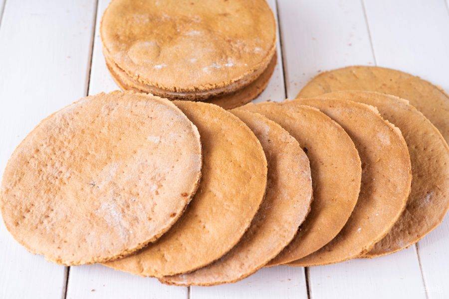 У меня получилось в итоге 10 круглых коржей диаметром 16 см. После остывания они становятся твердыми, хрупкими.