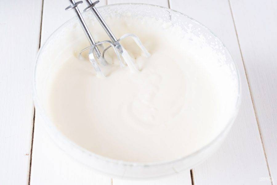 Миксером взбивайте сметану с сахарной пудрой до получения однородного крема. Итоговый крем все равно получается не густой, но для медовика этот крем просто идеальный.