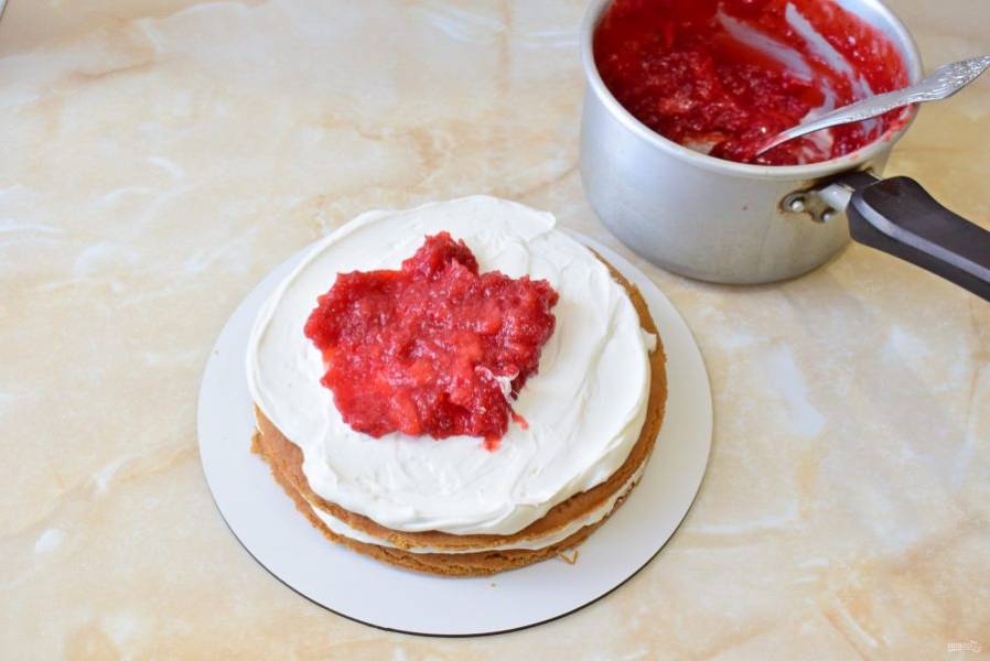 Медовые коржи смазывайте кремом и добавляйте клубничную начинку. Немного крема оставьте для внешней обмазки торта.