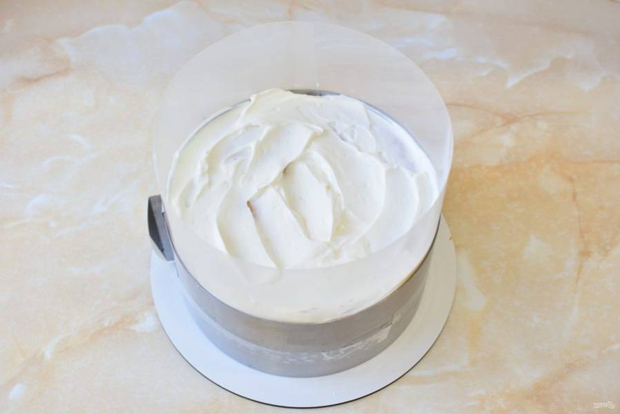 Чтобы торт получился ровный, оберните его ацетатной пленкой и затяните в кольцо. Уберите на 6 часов или на ночь в холодильник.