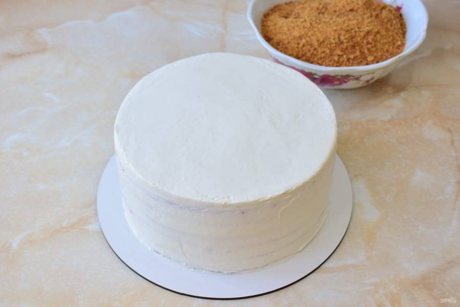 Пропитанный торт освободите от упаковки. Обмажьте бока и верх кремом. Добавлять много крема и тщательно обмазывать не надо. Достаточно лишь, чтобы было где обсыпать крошкой.