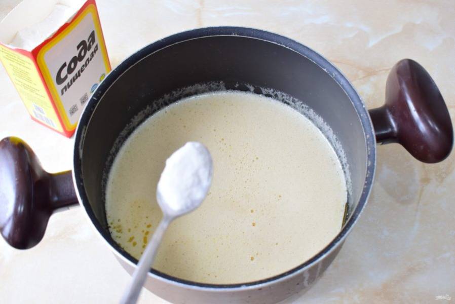 Соедините яичную массу с медовой (не горячей!). Все верните на огонь и доведите до кипения. Вмешайте соду.