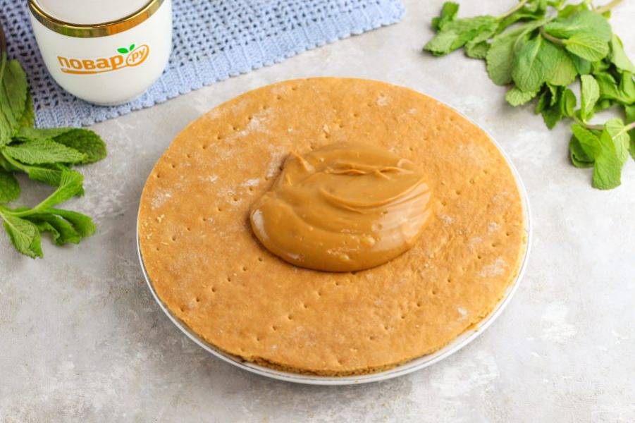 Выложите один корж на тарелку и добавьте на него 1,5-2 ст.л. крема. Обмажьте по свей поверхности.