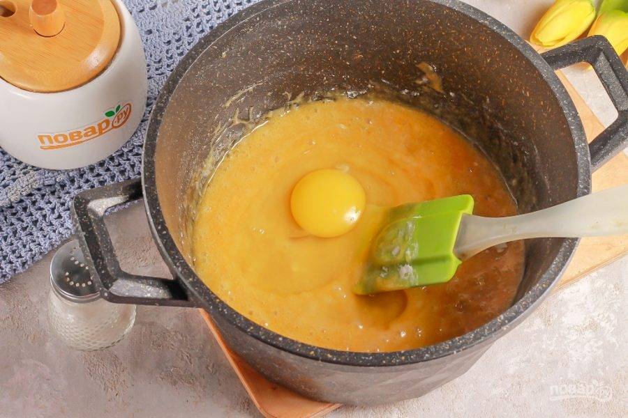 Всыпьте треть пшеничной муки и замесите вязкое тесто. Это делается для того, чтобы при добавлении яиц, они не свернулись в горячей массе.
