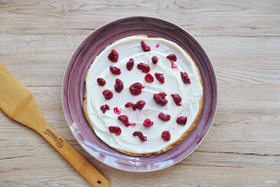 На первый и третий корж выложите вишню без косточек. Можно добавить больше вишни, но это дело вкуса.