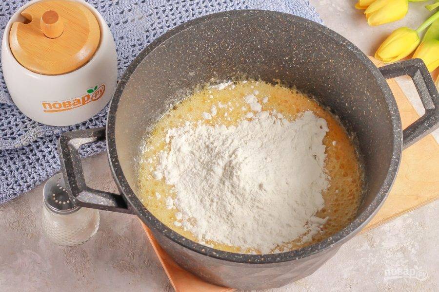 Всыпьте немного муки и перемешайте. Сначала добавляйте муку, так как если вы добавите яйцо в горячую массу, то оно сразу же свернется.