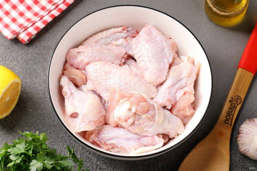 Крылья промойте, обсушите, удалите фалангу и разрежьте по суставу на две части.