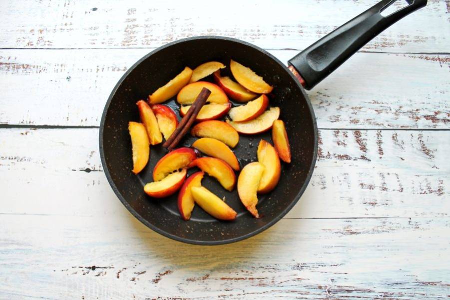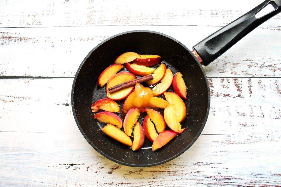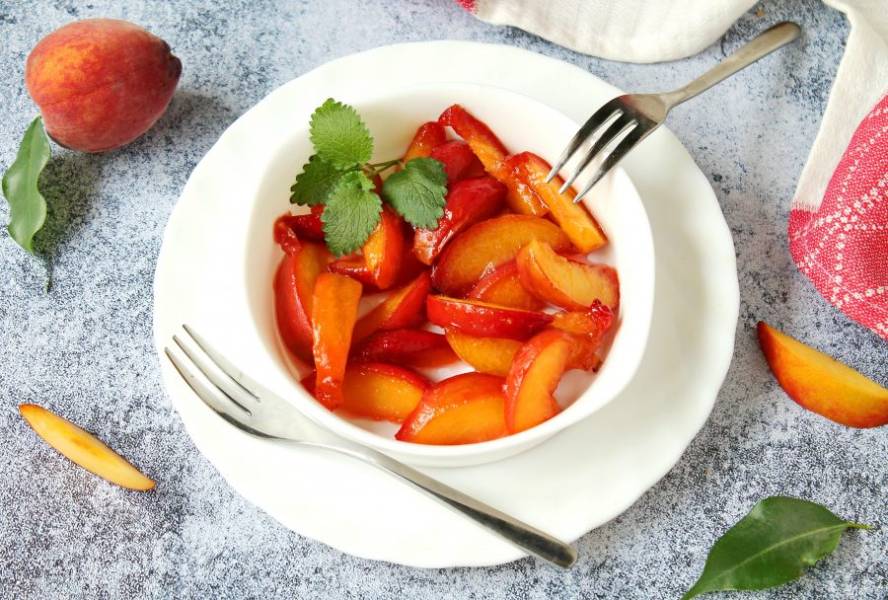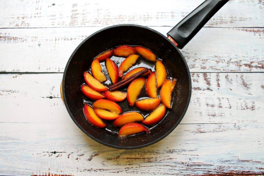 Готовьте персики, перемешивая, еще 1-2 минуты, снимите и подавайте.
