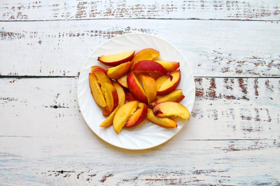 Персики тщательно вымойте, обсушите, удалите косточки и порежьте на дольки.