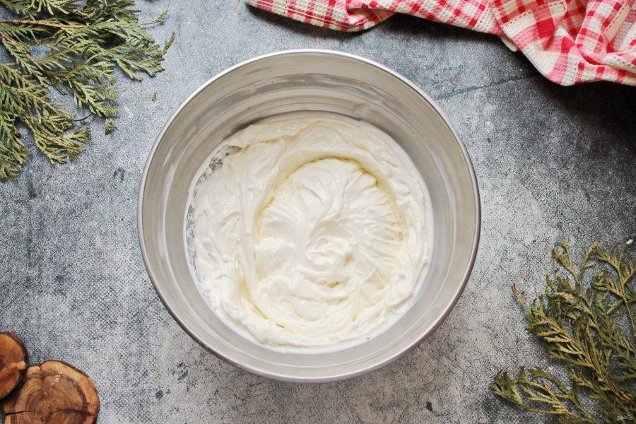 В миску выложите сметану, сыр и сахарную пудру. Тщательно взбейте до однородного, пышного крема.