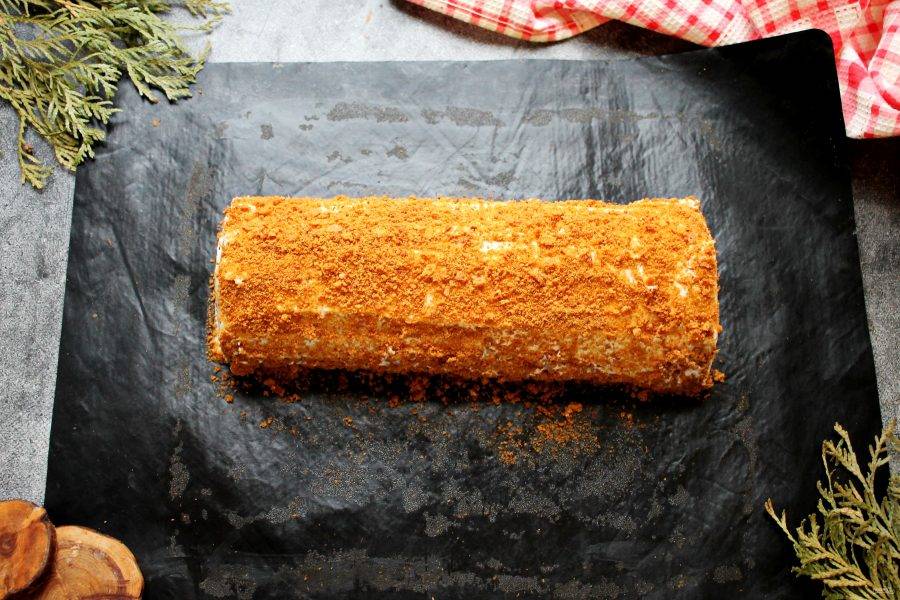 Полностью обсыпьте медовый рулет крошками из обрезков и уберите в холодильник на 5-7 часов, для пропитки и стабилизации.