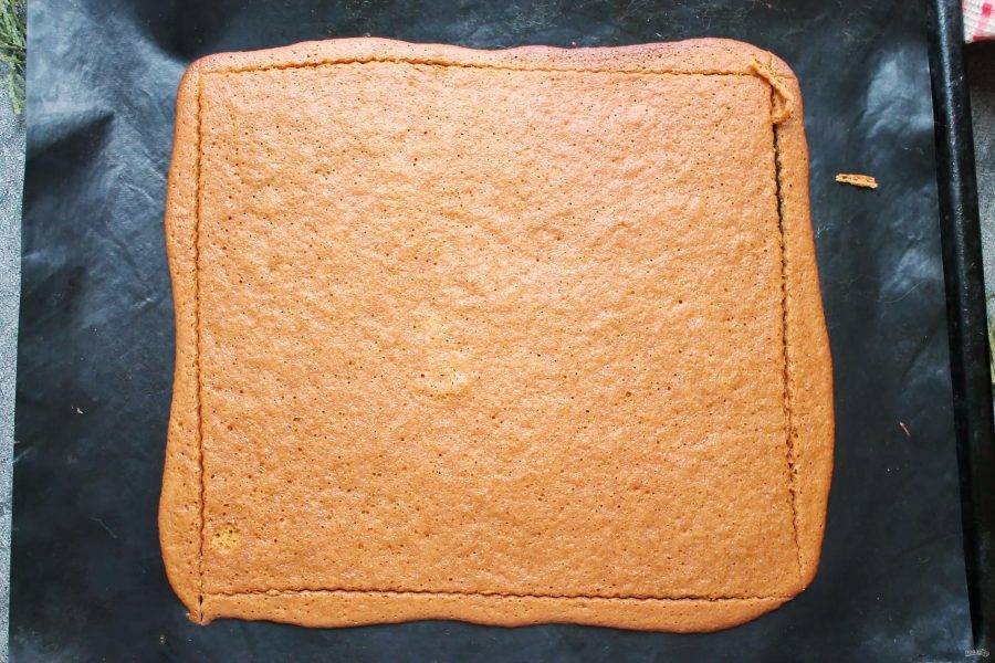 Противень застелите пергаментом или ковриком для выпечки и нанесите тесто тонким слоем. Противень поставьте в горячую духовку и выпекайте при температуре 180 градусов в течение 10-12 минут. Готовый корж достаньте и выровните, обрезав края, остудите. Обрезки оставьте, они нам еще понадобятся.