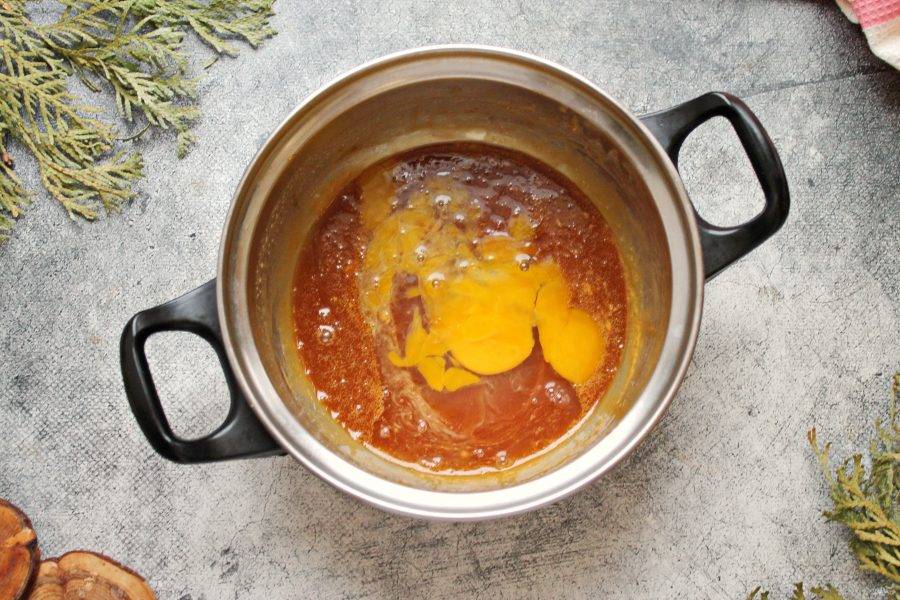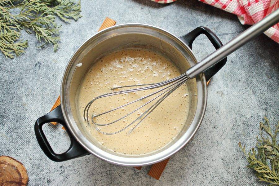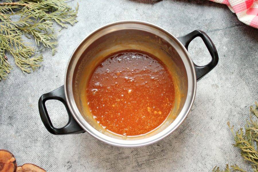 Все перемешайте и варите на медленном огне, мешая, до карамельного цвета, это займет несколько минут. Масса сначала будет сильно пениться, а затем осядет.
