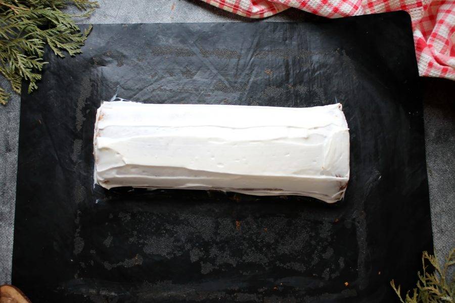 Обрезки измельчите. Корж отделите от пергамента и положите обратно. Нанесите на поверхность 2/3 крема и сверните в рулет, помогая пергаментом. Оставшимся кремом полностью покройте рулет.