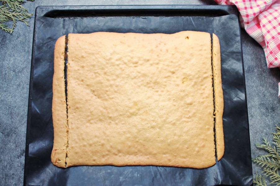 Готовый пласт достаньте, переверните на чистый пергамент, срежьте края и без них сверните в рулет. Заверните его в полотенце и оставьте до полного остывания.