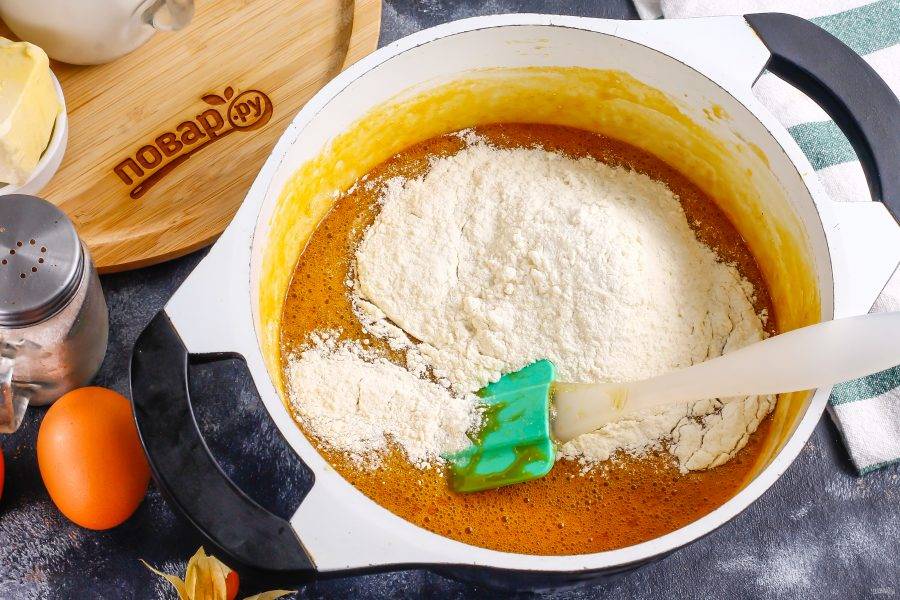Влейте яичную массу в слегка остывшую карамель, иначе яйца могут свернуться! Тщательно вымешайте и всыпьте пшеничную муку и разрыхлитель.