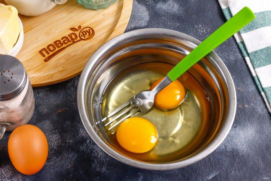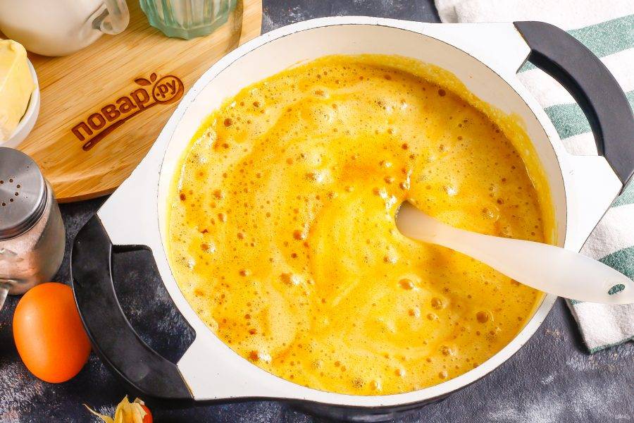 Влейте молоко или сливки жирностью не выше 30% и выложите куриный желток. Тщательно взбейте массу.