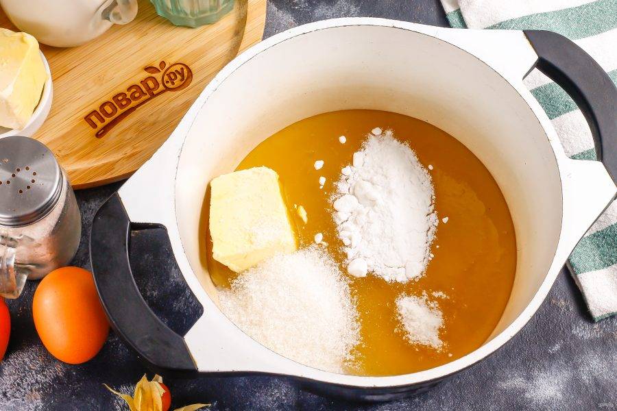 В глубокую емкость с антипригарным дном: казан или кастрюлю выложите цветочный мед, сливочное масло, всыпьте соду и сахарный песок, соль. Поместите емкость на плиту, включая средний нагрев.