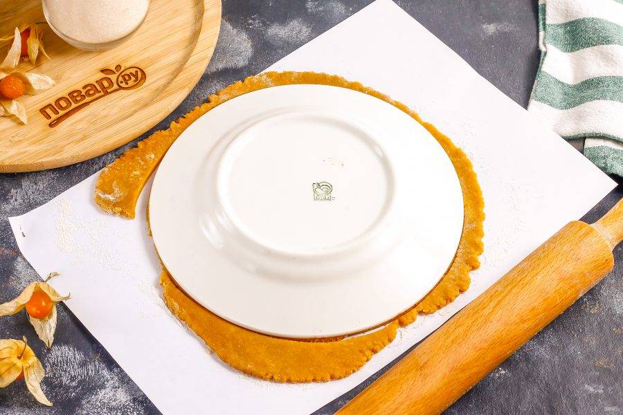 В это время тесто охладится. Разделите его на части. Каждую часть раскатайте на пергаментной бумаге, не смазывая ее ничем. Мне удобно выпекать коржи на листах формата А4, сразу же вырезая из теста круги с помощью тарелки.