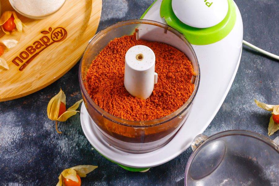 Два отложенных коржа разломите на кусочки и высыпьте их в чашу измельчителя. Измельчите в крошку примерно 3-5 минут.
