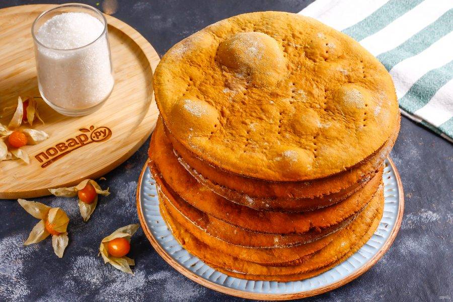 Разогрейте духовку до 200 градусов и испеките по одному или по два коржа в ней примерно по 5-10 минут, следя за ними, чтобы не подгорели. Диаметр коржей на фото — 18 см.