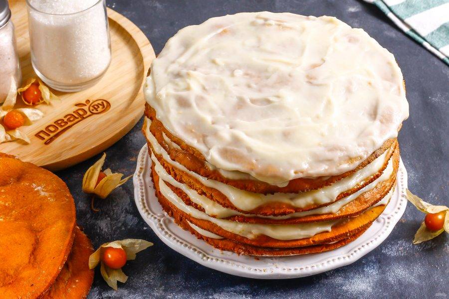 Соберите торт, выкладывая на каждый корж часть заварного крема и размазывая его. Желательно крема выкладывать не мало, чтобы торт получился сочным. По желанию можно сначала смочить коржи сладким сиропом или водой с медом, а затем выкладывать крем. Верх и бока десерта обмажьте кремом.