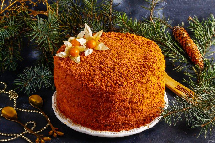 Невероятно сочный медовый торт станет главным украшением новогоднего стола. Вы можете оформить десерт с помощью граната, физалиса, веточек розмарина, мандаринов или других фруктов, ягод.