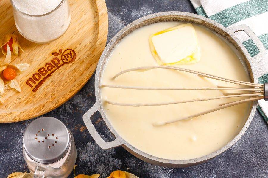 Поместите емкость на плиту, включив средний нагрев. Заварите крем до густоты примерно 10-12 минут, постоянно помешивая, чтобы не образовались комочки в нем. Затем нагрев выключите и вмешайте в крем сливочное масло. Накройте десерт пищевой пленкой стык в стык и отнесите на холод примерно на 1 час.