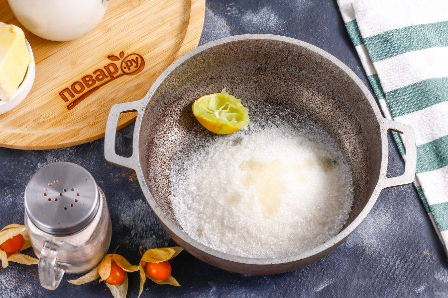 Пока тесто остывает, приготовьте заварной крем. Всыпьте в казан или ковш с антипригарным дном сахарный песок, добавьте лимонный сок — он оттенит сладость крема.