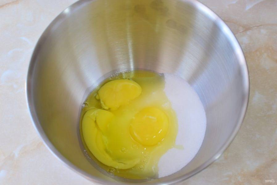 Для теста соедините яйца с сахаром и взбейте их в пену.