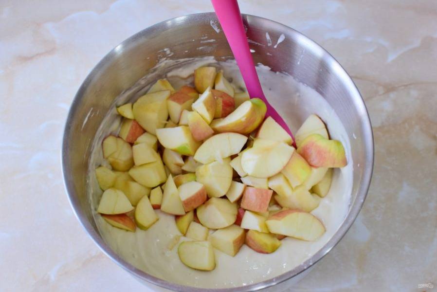 Нарезанные яблоки вмешайте в тесто. Чем больше яблок, тем вкуснее будет пирог.
