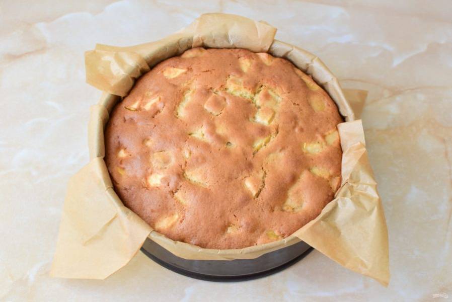 Форму для выпечки (22-26 см.) застелите кулинарным пергаментом и выложите тесто с яблоками. Поставьте пирог в духовку, предварительно разогретую до 180 градусов, примерно на 40-50 минут. Ориентируйтесь по своей духовке.
