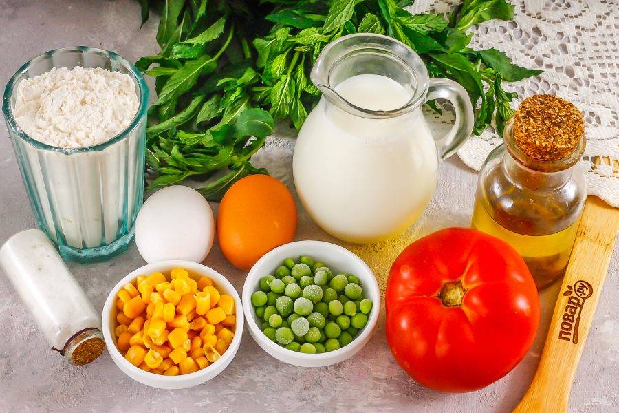 В это время промойте и нарежьте помидор мелкими кубиками, удаляя сердцевинку. Прогрейте сковороду и смажьте ее первый раз растительным маслом. Влейте часть теста и быстро выложите в него кукурузу, горошек и нарезку помидора в хаотичном порядке. Если тесто уже "схватилось", то влейте еще немного, чтобы все добавки зафиксировались в нем. Обжарьте примерно 1-2 минуты.