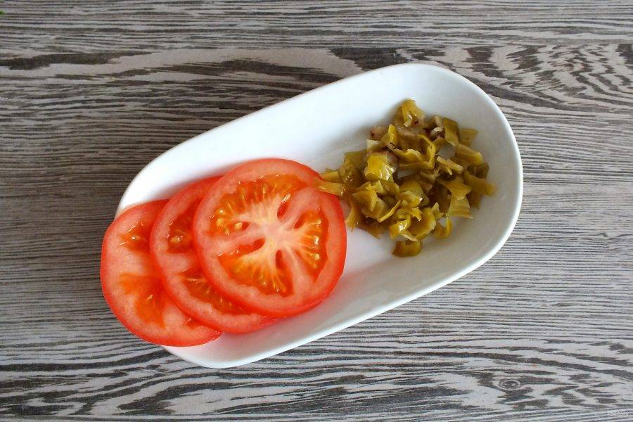 Оставшиеся острые перцы нарежьте мелким кубиком. Помидоры нарежьте шайбочками.
