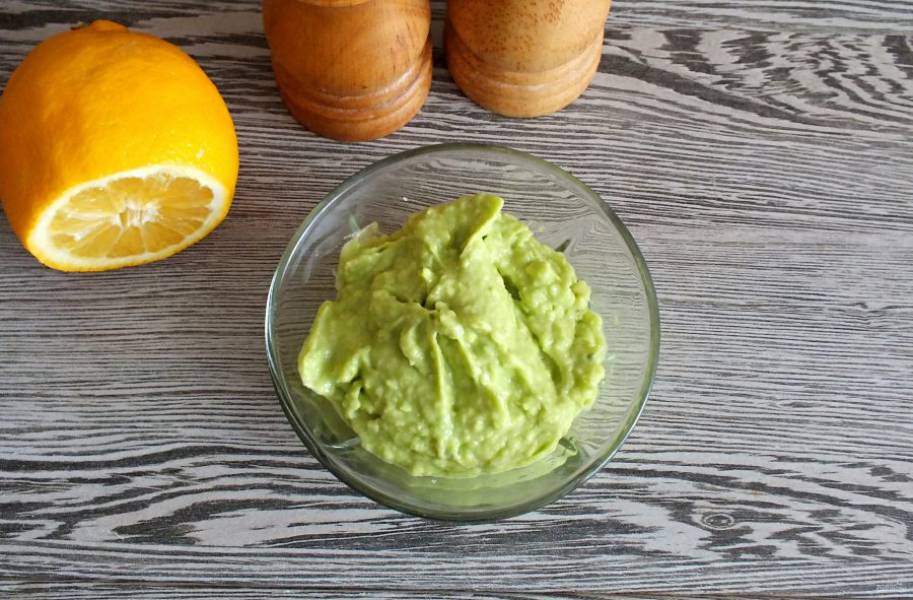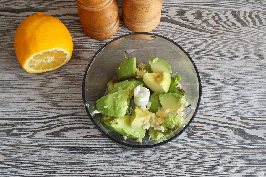 Сделайте гуакамоле. В чашу блендера выложите разрезанный на несколько частей авокадо, 1 измельченный зубчик чеснока, растительное масло и сок из четвертинки лимона, соль, черный перец.