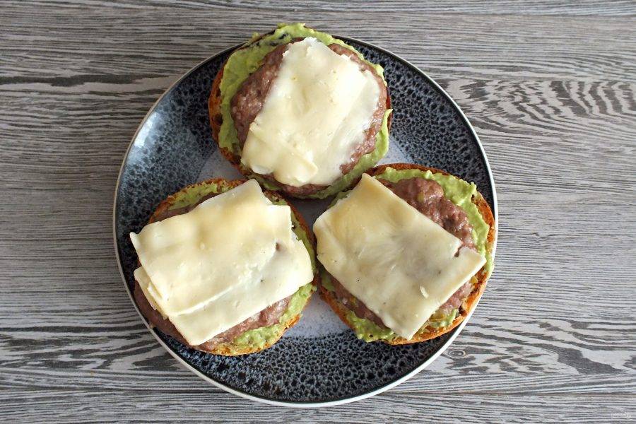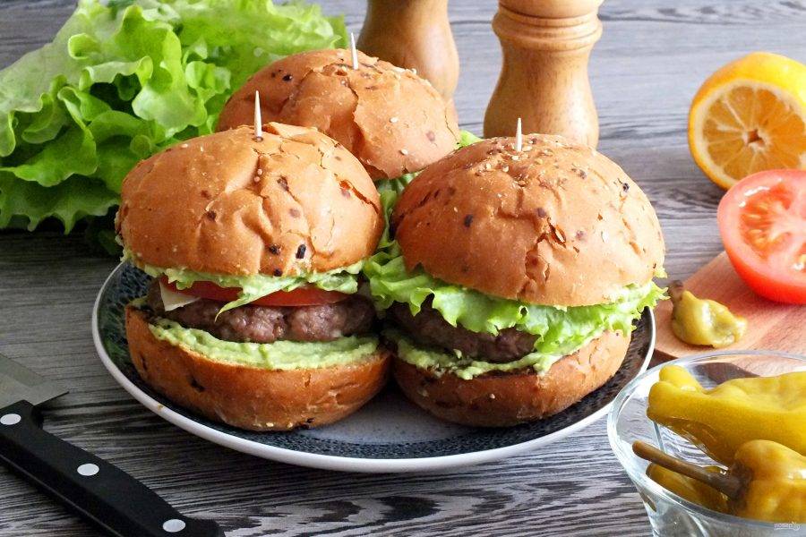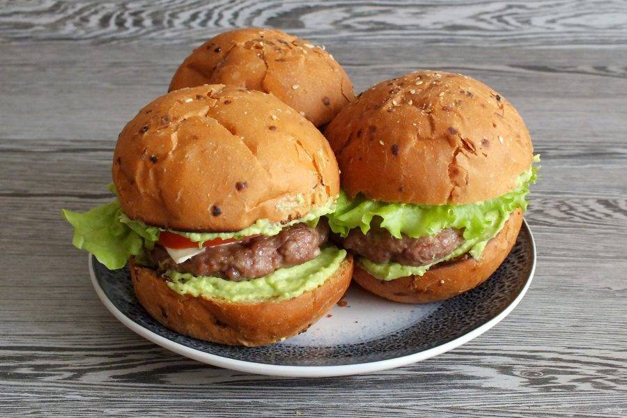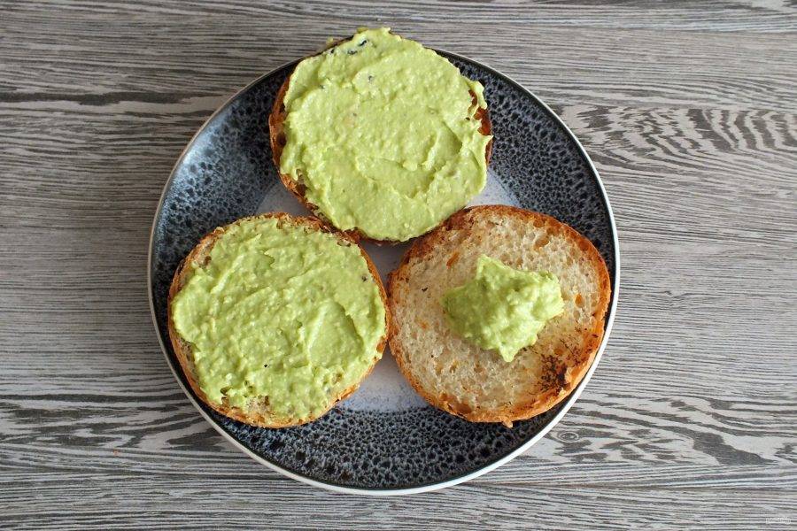 Соберите бургеры. Разделите гуакамоле на 2 части. Одной частью смажьте половинки булочек.
