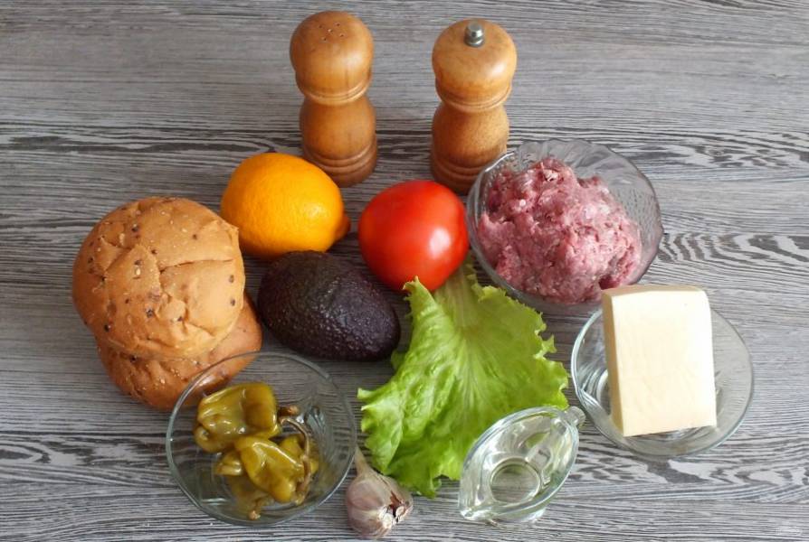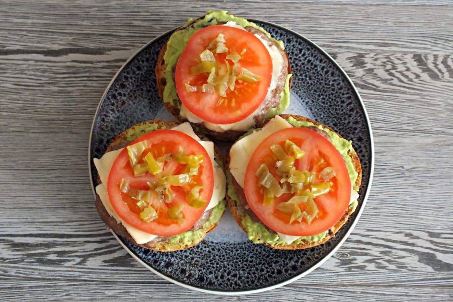 После положите салатный лист, опять измельченный перец. Прикройте верхушкой булочкой, которой предварительно смажьте гуакамоле.