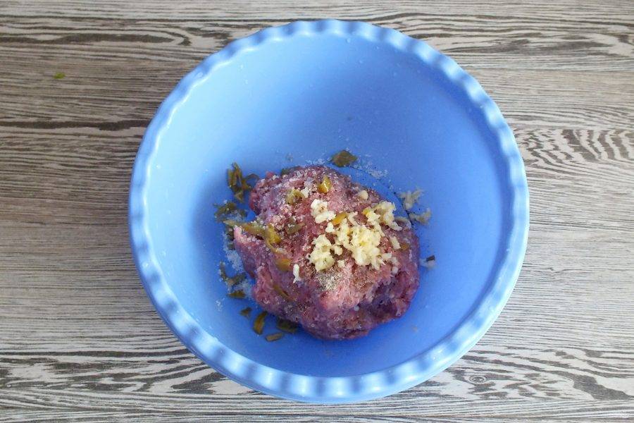 Выложите фарш в чашу, добавьте 1 мелко резанный острый перец, 2 зубчика чеснока, соль, черный перец. Хорошо вымешайте. Отбейте фарш несколько раз о дно чаши.
