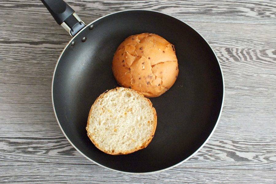 Каждую булочку разрежьте на две части и подсушите на сухой сковороде.