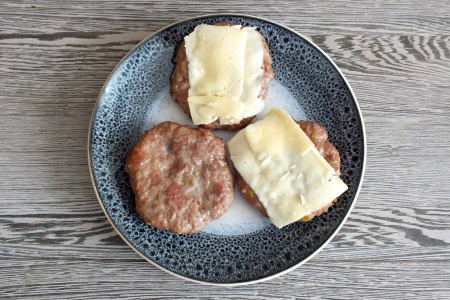 На готовые, теплые котлеты выложите сыр и отставьте в сторону.