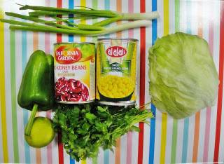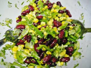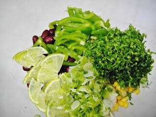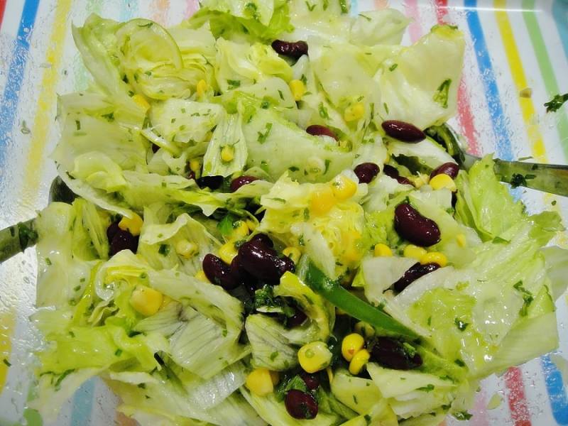 Рецепт приготовления салата с лебедой, черной фасолью, кукурузой. Болгарским перцем, чили, кинзой, зеленым луком и пикантным соусом.