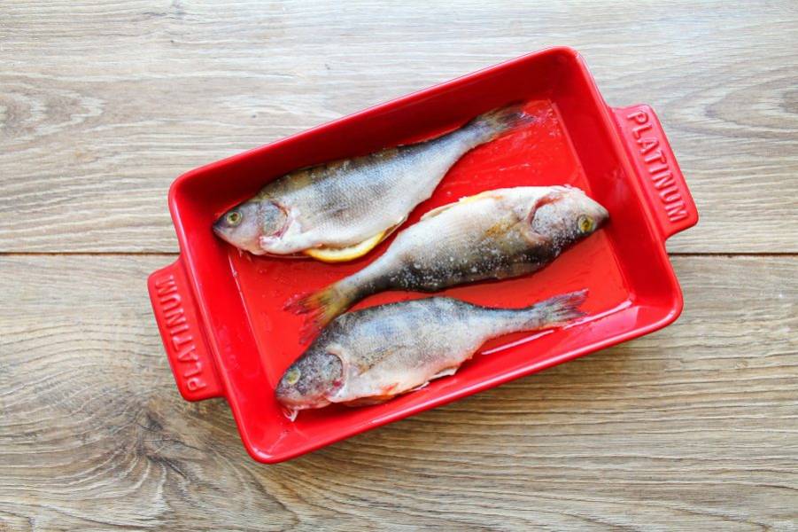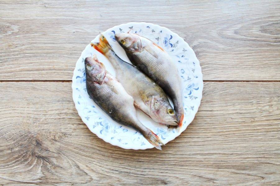 Подготовьте все необходимые ингредиенты для приготовления мелкого окуня с чешуей в духовке.