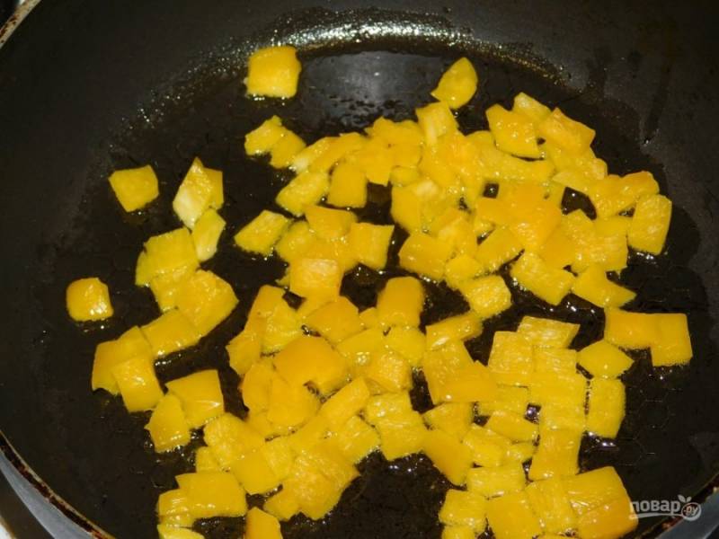 Болгарский перец нарежьте и обжарьте до мягкости в течение 5 минут.